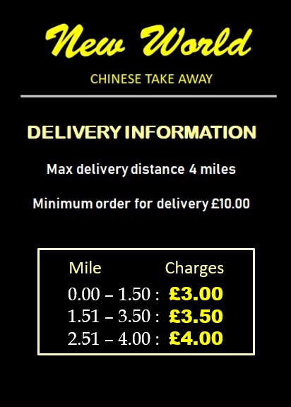 New World Chinese Takeaway serves variety of delicious Chinese dishes. We’re passionate about delivering hot, great tasting, freshly prepared Chinese food to our customers
